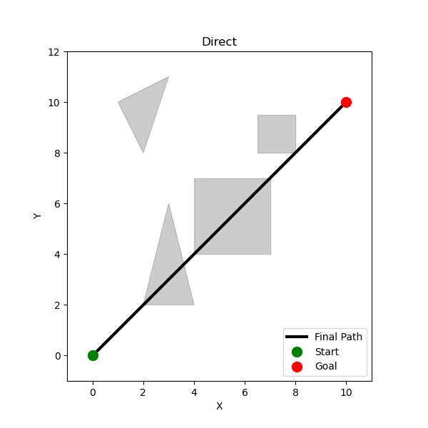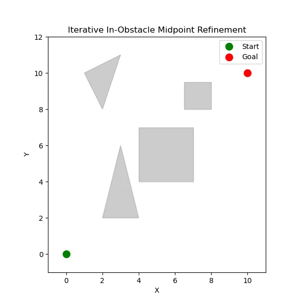 A start point has been defined at and an endpoint at There are four polygons which will act as our obstacles.