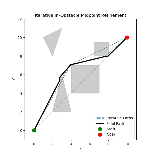 Next, if you are working in an environment that only uses shapes like squares/cubes, triangles/slopes & circles/spheres, then you could update the algorithm as mentioned before to find the optimal position to place the midpoint when inside of an obstacle. It should be positioned perpendicular to the shapes most extruded vertice in a direction, and move to that vertice so that the string perfectly conforms to that shape.