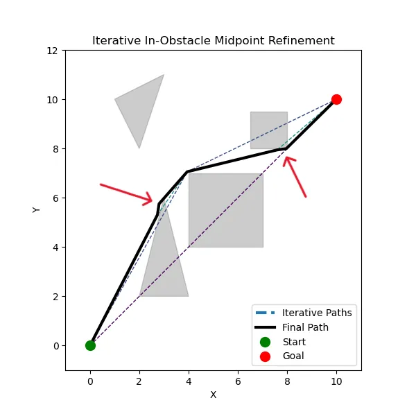 The main problem that this causes is that there is no real way of knowing where to set the midpoint when inside of an obstacle, besides the actual midpoint. In an ideal scenario, the “midpoint” would be perpendicular to the widest vertice of the shape it’s inside. Then, that “midpoint” would be moved to the position of said vertice, so that the imaginary string conforms perfectly to the shape of the obstacle.